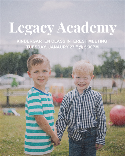 For more details- Come join us for our interest meeting on Tuesday, January 27th at 5:30 PM. This will be a time to cast the vision of Legacy Academy as well as give parents an opportunity to ask questions.